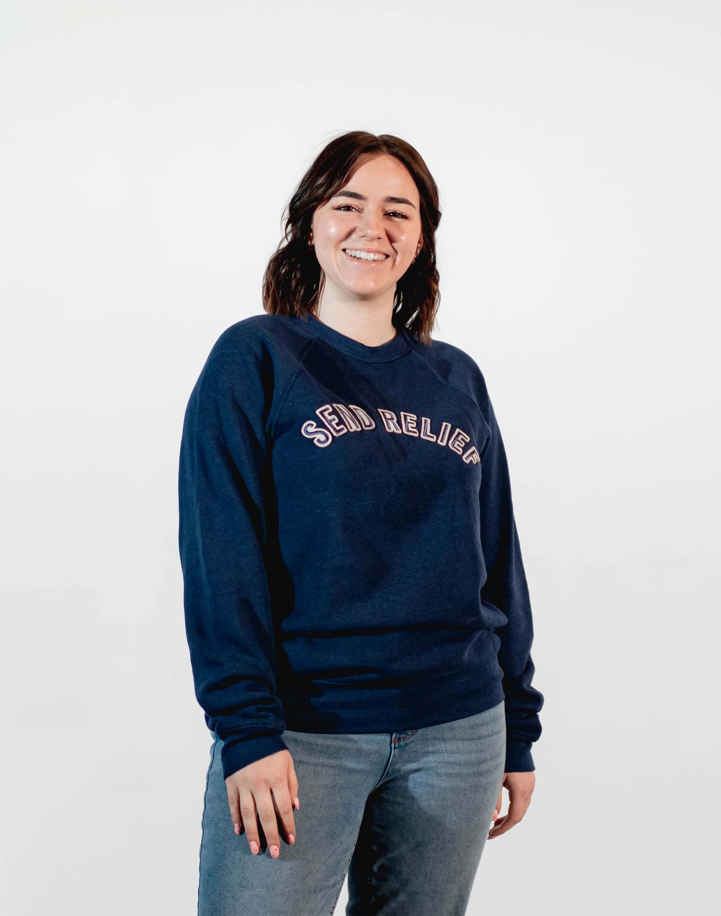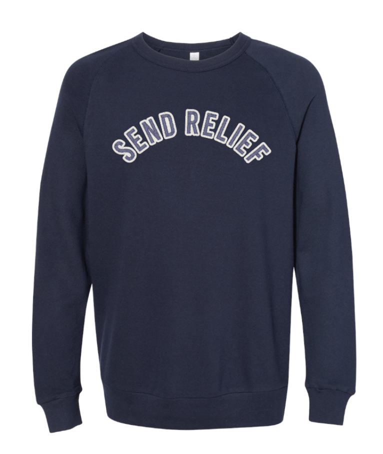 Heather grey with the Send Relief logo across the chest in navy on white.